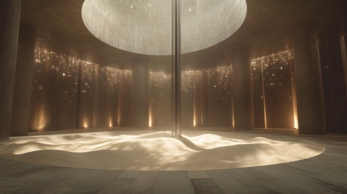 a circular temple room with a thick layer of sand obscuring the floor, the smooth stone walls have strange constellations - a long, thin metal pole connects the floor to the ceiling - hyper realistic --ar 16:9