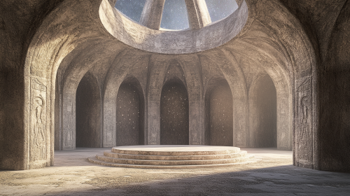 a circular temple room with a thick layer of sand obscuring the floor, the smooth stone walls have strange constellations - the walls slope upwards to form a perfect dome with no openings in it - hyper realistic --ar 16:9
