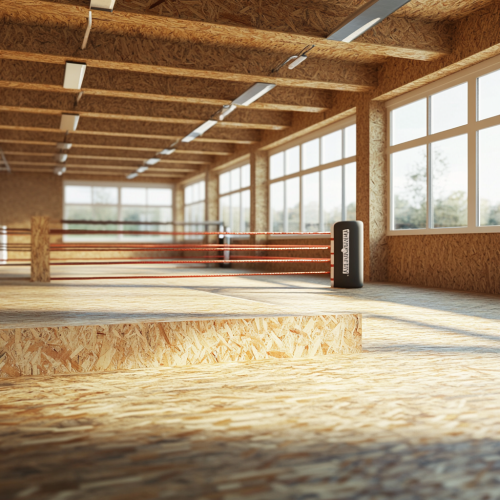 photorealistic image: a boxing ring on a sports field. The boxing ring is made of wood. More precisely: the floor and the pillars are made of OSB boards. The setting is bright and harmonious. Perspective from the side
