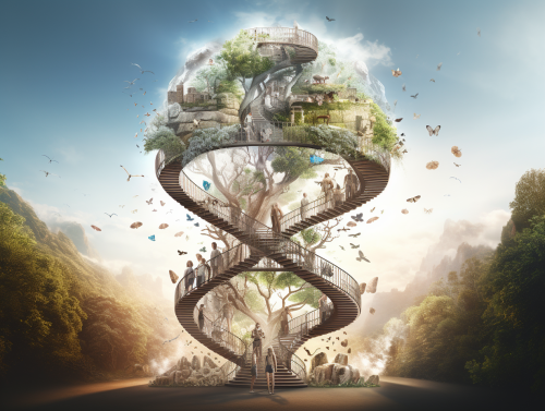 A DNA double helix intertwined with various scenes of life experiences such as graduation, a nurturing family, and overcoming obstacles, emphasizing the environmental impact on self-worth, photorealistic, 300 dpi, 4k, --ar 4:3