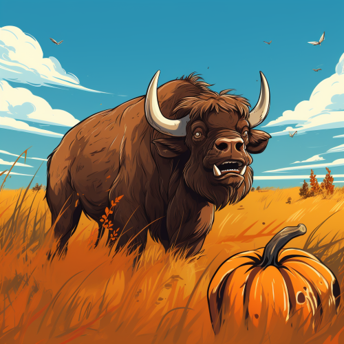 a cartoon buffalo, carving a pumpkin into a jack-o-lantern, in a grass plain, natural bright colors.