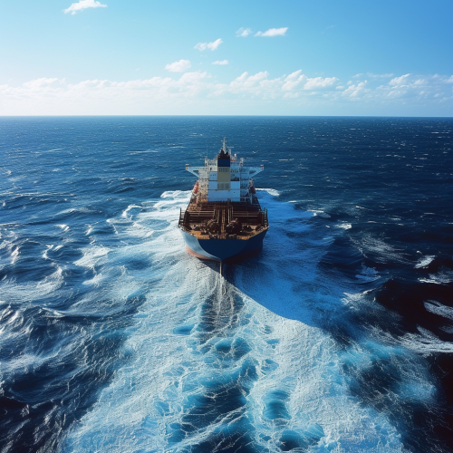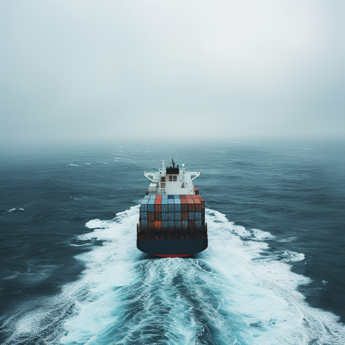 a dark blue white huge cargo ship sailing in the middle of the open ocean, choppy seas, --v 6.0 --ar 1:1 --style raw