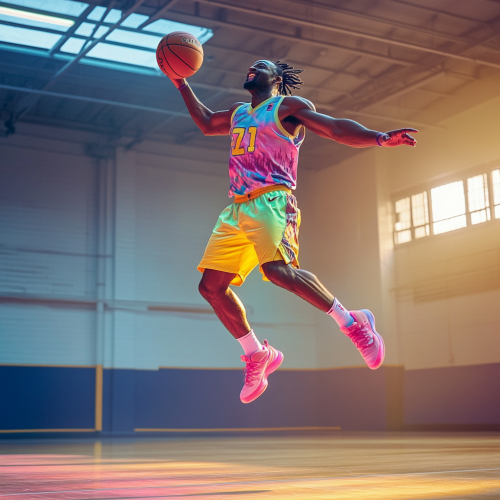 a basketball player jumping for a shoot during a game, wearing a incredibly colourful basketball clothing. Set at a basketball court, warm cinematic lights, realistic photography taken by a Nikon d750