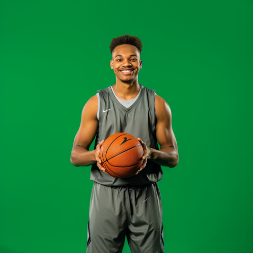 Create an ultra photo-realistic image of a male college basketball player posing for a photo. The player is standing confidently in front of a green screen background, facing the camera, holding a basketball in both hands. He is dressed in a grey-colored college basketball uniform, without any specific team logos or marks. The player is smiling, and is physically fit but not too muscly. The focus should be on capturing the essence of a college athlete, with attention to detail in the uniform, basketball, and the player's athletic build, set against the plain green screen background. --v 6.0