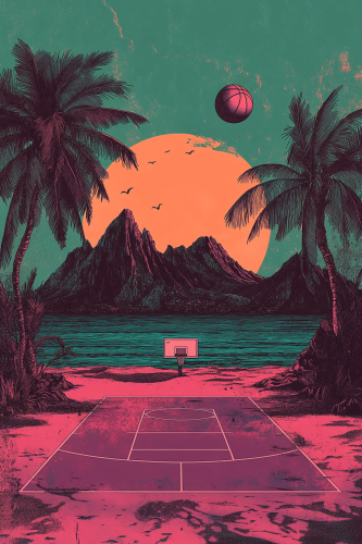 Paradise beach with basketball court, synthwave, doom illustration, t-shirt graphic, centered on a plain background, glow, old, dirty, worn, surreal, block colours, block print style, lino print style --ar 2:3