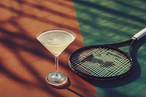 a fancy vodka martini sitting over a tennis racket which is on court floor, the tennis court is classy, retro-chic, afternoon sun hours --ar 3:2 --v 6.1