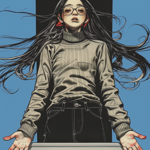 Cinematic scene of a long haired asian woman with glasses standing on a ledge in front of a tall, rectangular doorway or opening, which has a stark contrast with the bright blue background surrounding it. She is wearing a gray turtleneck sweater, dark pants, and holds his arms wide open, appearing both triumphant and vulnerable. Her face shows an expression of relief or liberation as she faces forward, eyes partially closed and head tilted slightly upward. This pose conveys a powerful sense of freedom or self-acceptance, as though she is stepping out of an enclosed space into a new world. Her face is merely a silhouette due to a shadow cast over her form. --sref 2178024008 --v 6.0