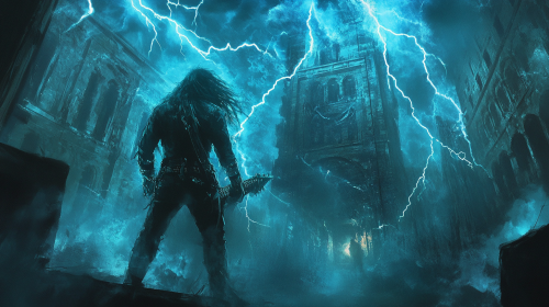 James Hetfield in 1989 standing triumphantly in an insane asylum, surrounded by blue lightning. This is a fantastical scene is depicted in the style of a fantasy art painting. --ar 16:9