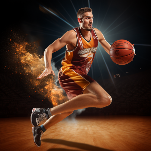 An awe-inspiring basketball court illuminated by the fiery wings of a rising phoenix, set within glowing embers that symbolize rebirth, resilience, and confidence. The court is bathed in warm hues of gold, orange, and red, creating an uplifting and powerful atmosphere. The center of the court has a subtle glow, with the edges fading into the fiery aura, leaving space at the top for text. The hoop and backboard are etched with intricate phoenix feathers, reinforcing the theme of transformation and strength --ar 2:3 --s 250 --v 6.1