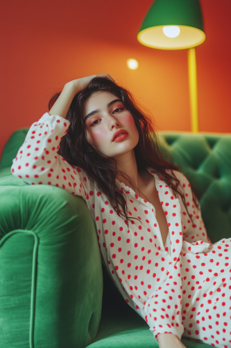 Photoshooting of Beautiful girl from instagram sending a photo in pijama sitting at green sofa with in cozy interior sensitive background --ar 2:3 --style raw --v 6.1