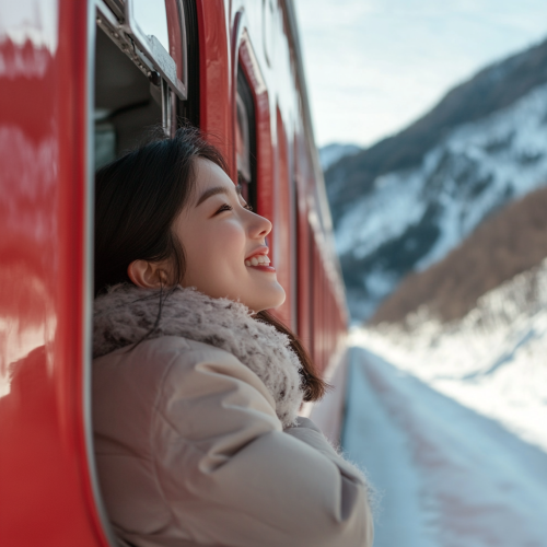 Close-Up shot, side view, looking at side hyper realistic, winter, afternoon, sunny, korean Solo, Snowy mountains, red train travel, Korean female tourist sticking her head out of the train window and smiling happily, Canon EOS R5 with a 200mm lens, --style raw --v 6.1 --ar 1:1
