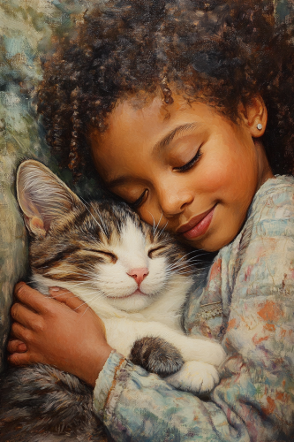 illustration of a kitty cat, curled up next to a 5-years old african american girl, her owner, highlighting the special bond between humans and animals in the style of Norman Rockwell --ar 2:3 --v 6.1 --stylize 250