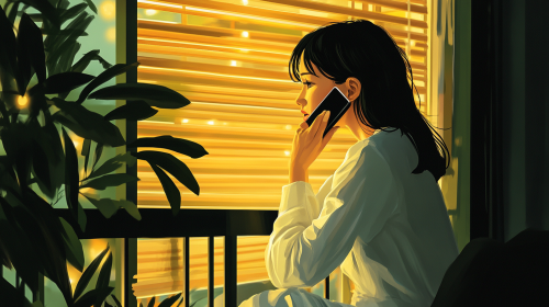 a girl with black hair in her 25s at her balcony talking over phone call in the night wearing white night wear, in pleasant mood, balcony blinds are closed with mustard yellow mats, use colors, olive green, --ar 16:9