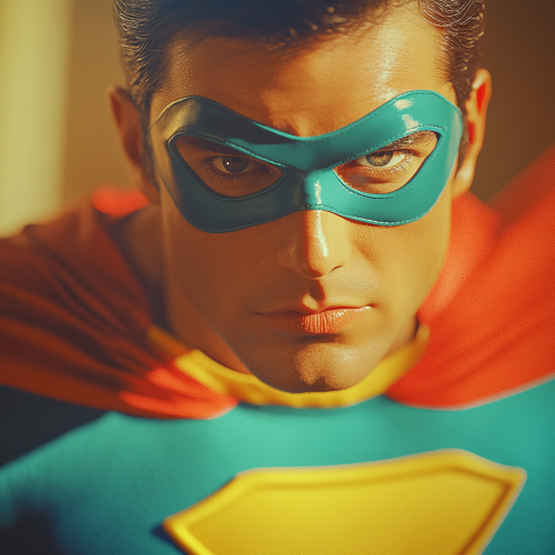 the super hero invincible but set in a 1950s Panavision tv scene, shot in rich, vibrant Technicolor with soft focus edges, featuring a classic Hollywood style. The film grain is subtle but visible, replicating the texture of 1950s cinema. Realistic depth of field, high contrast, and slightly oversaturated colors, framed in a widescreen 16:9 aspect ratio