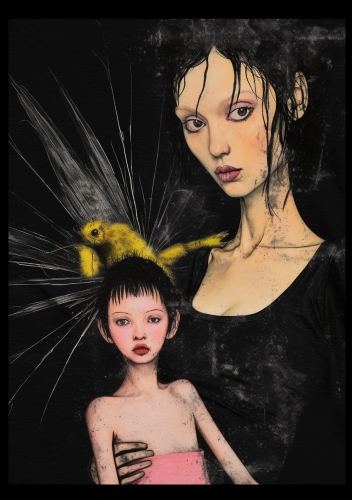 Morbid tarot, stoner illustration, t-shirt graphic, centered on a plain background, glow, old, dirty, worn, surreal, block colours, block print style, lino print style --ar 2:3