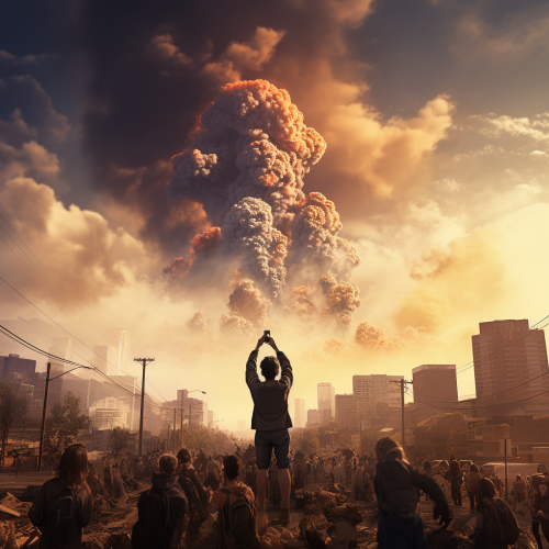 the last selfie on earth, world population on the streets, eminent apocalypse incoming, cloudless sky, burning buildings in the distance.