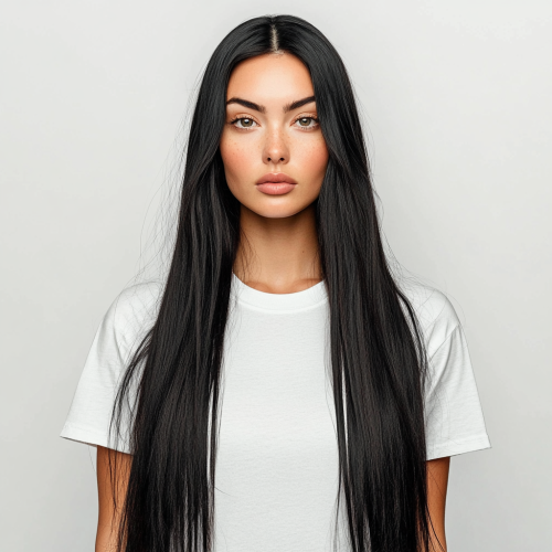 t-shirt mockup, gorgeous female model with long black hair. Her hair is combed straight back so that it doesn’t touch the front of the shirt. She’s wearing a white bella canvas 3001 crewneck t-shirt , facing forward in a fashion photoshoot pose, professional photo, photo realistic with detailed skin texture and detailed fabric, natural lighting, minimalist white background