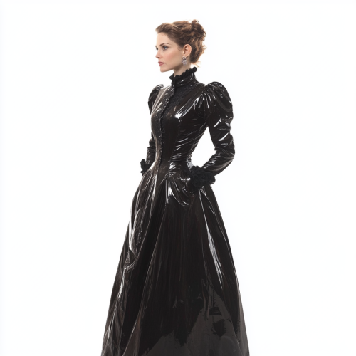 lady, 40 years old, wearing elegant shiny black patent leather wardrobe, 19th century style, standing upright, looking serious, full body shot, side view, white background