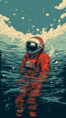 astronaut swims in the depths of the ocean, Wes Anderson illustration style, a little abstraction, --ar 9:16
