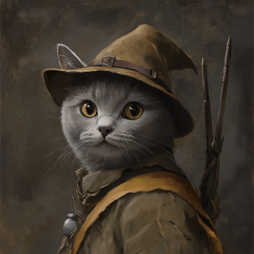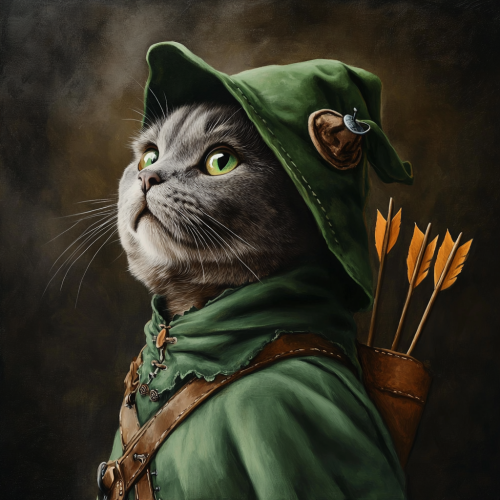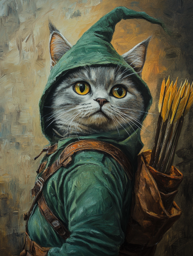 Foreground of a gray European Shorthair cat, dressed as robin hood. Hat on head and quiver on the back. Looking forward. Realistic old oil painting style --style raw