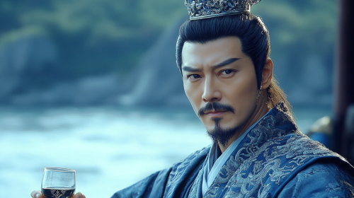 Medium shot, close-up, the camera switches to Cao Cao, who is wearing a gray-blue battle robe and a silver crown, with a stern and confident expression. Cao Cao stands at the bow, holding a wine glass, looking at the river in the distance, with a slight contemptuous smile on his lips. Cao Cao's appearance should be consistent in all shots, showing his mature and calm temperament. Accessories such as the silver crown and dragon-patterned battle robe should be unified to show his heroic momentum. --ar 16:9