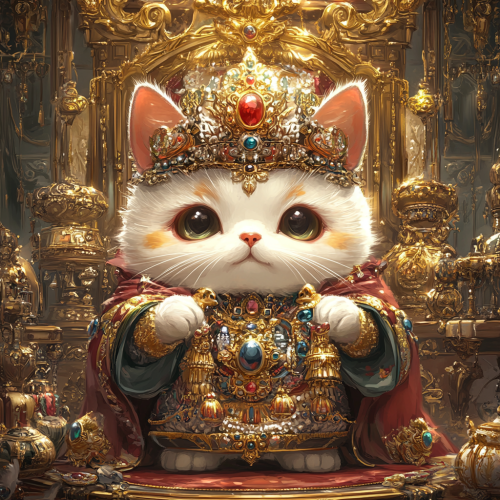 A regal chibi cat depicted as a very rich king. The cat wears an elaborate crown adorned with jewels and a luxurious robe with gold embroidery. The background features a lavish throne room filled with golden treasures, ornate decorations, and rich, elegant furnishings, highlighting the cat’s immense wealth and royal status. The cat has a majestic and content expression, emphasizing its grandeur and nobility. 4K, HDR, highly detailed