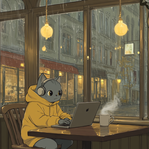 A cozy Viennese café in the style of a Ghibli animation, with warm, inviting lighting. A rainy day outside the large windows reveals the charming streets of Vienna, with raindrops gently running down the glass. Inside the café, a cute, slightly chubby gray Munchkin cat with short legs and wide, round eyes is sitting at a wooden table, wearing a bright yellow hoodie and headphones, intently working on an Apple laptop. The cat is focused, its small paws typing away on the keyboard, with a steaming cup of coffee beside the laptop. The atmosphere is peaceful and calming, with soft reflections of the rain on the café floor. The warm, cozy lighting and soft textures create a perfect scene for a lo-fi music channel background, with Ghibli-style details, intricate textures, and a serene, dreamy mood
