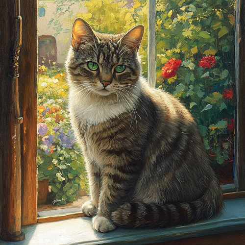 Create a captivating portrait of a feline cat with striking green eyes, sitting gracefully on a sunlit windowsill. The cat's fur is a mix of soft gray and white, with delicate patterns that catch the light. In the background, a lush garden filled with colorful flowers and greenery can be seen through the window, enhancing the serene atmosphere. The focus is on the cat's expressive eyes, which reflect curiosity and wisdom, inviting viewers into its world