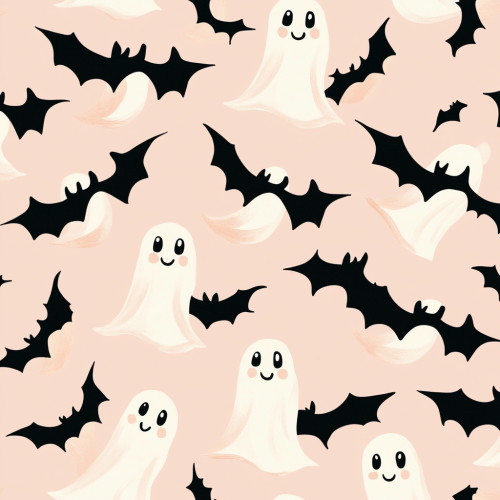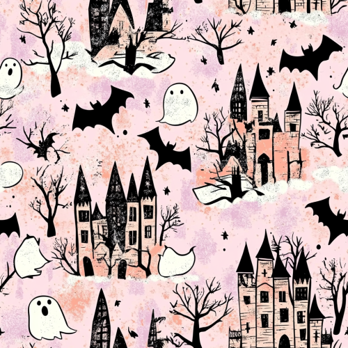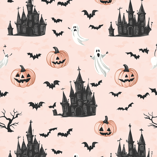 design and create seamless repeat pattern halloween inspired with pastel pinky theme, black bats, pumpkin, horror castle, flying chubby ghost, seamless repeat pattern, --tile