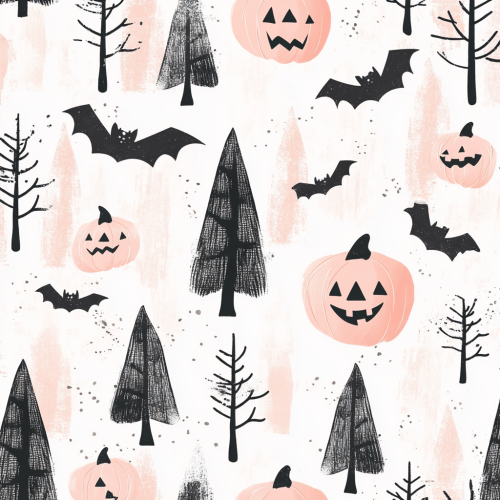 design and create seamless repeat pattern halloween inspired with pastel pinky theme, black bats, pumpkin, horror forest, flying ghost, seamless repeat pattern, tile