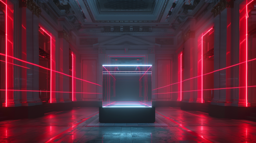 an empty museum at night with a empty glass box surrounded by red laser beams crossing the room, high definition, ultra realistic, 4k --v 6.0 --ar 16:9