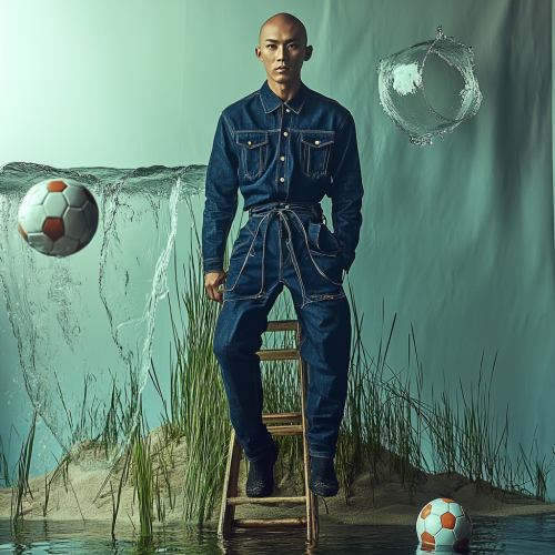 vogue fashion editorial of an Asian bald handsome man in denim clothes, whole body, standing in a studio with sand, water and grass, floating soccer balls, water in the background, a slice of water in the background. He stands on a ladder. High end fashion editorial with flash photography lighting