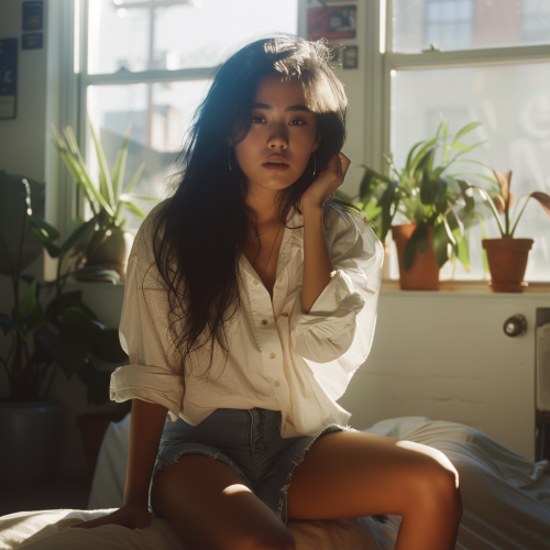 beautiful asian girl wearing mans oversize white shirt and denim shorts sitting in 1980's new york loft apartment flooded with sunlight --style raw --v 6.0