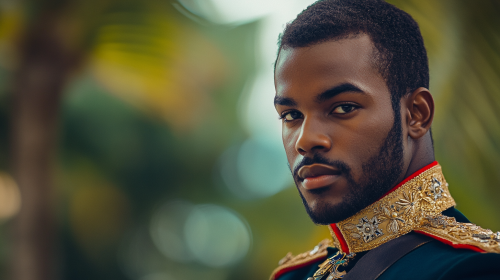 A portrait of a handsome royal prince from Saint Lucia, vivid, portrait shot, Photorealistic, Sony A7 IV, 85 mm lens, f/2.8 aperture, 1/100 ms shutterspeed, --ar 16:9 --v 6.1