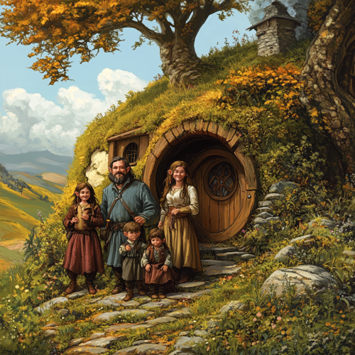 D&D style full body portrat picture of a hobbit family husband, wife and their three children ages 5, 8 and 2, standing in front of their d&d style hobbit style house built into the side of a hill.