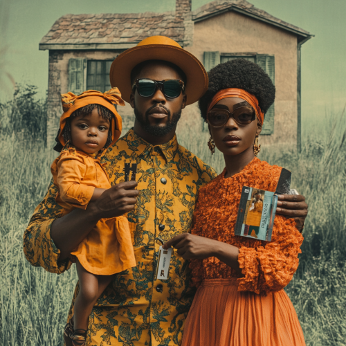 a colored skin family of 3, holding the keys of their beautiful new house that is behind them. The family is using travelling clothing and tavelling tickets. Realistic photograph style, beautiful light
