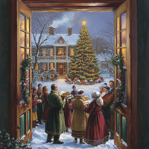 Christmas carolers Standing outside of a doorway looking into a house with Christmas decorations and a nice big Christmas tree in the center of the room. The carolers are singing to a group of people and a jolly grandma is only a plate of goodies