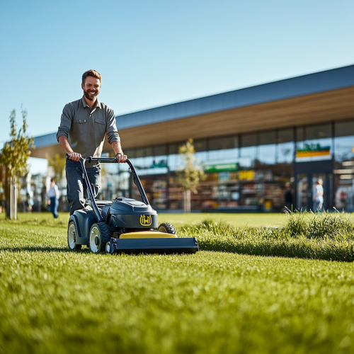 A cheerful man mowing the lawn outside a large supermarket on a sunny day. He is wearing casual work attire with a friendly smile, pushing a modern lawn mower over freshly cut grass. The supermarket building is visible in the background with clear signage, and a few shoppers are passing by, creating a welcoming and well-maintained atmosphere around the store.