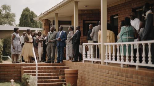 happy african wedding on front porch outside township family house, reception party, cheap wedding, township house south africa, Daylight, clean aesthetic, fujifilm --ar 16:9 --v 5.0