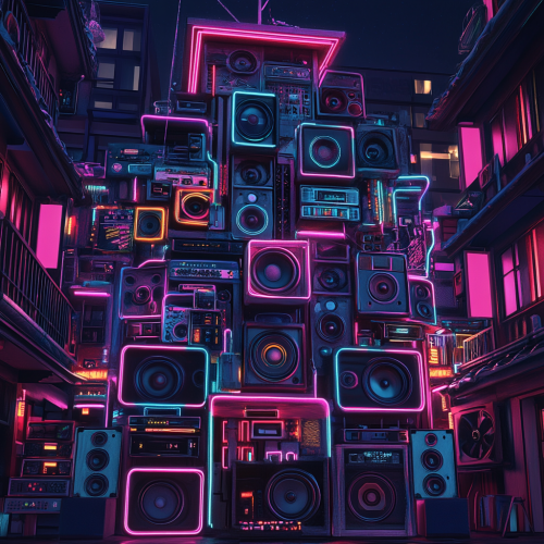 speakers stacked in front of a A multi-story neon party house. The neon party house is lined with a bunch of neon lights and speakers. dark coloration with neon highlights all over the house and speakers