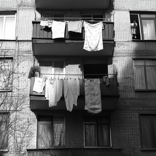 I need a houses front block panel construction eighties Russia style really run down with laundry hanging from the balcony on dark background black and white realization