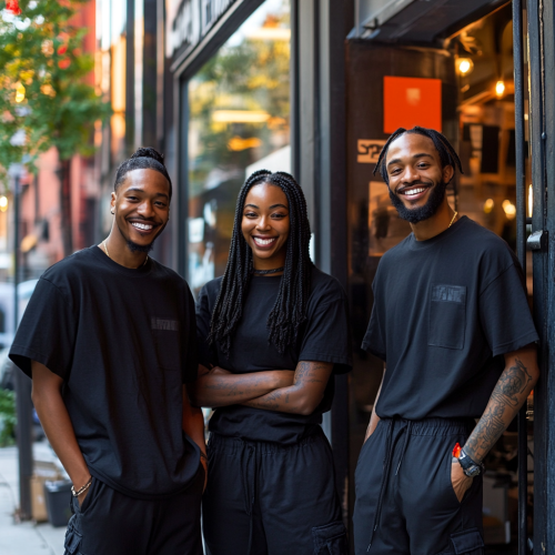 a hyper, realistic, three black crew and staff members dressed in matching black T-shirts, smiling and posing outside of their storefront recording studio