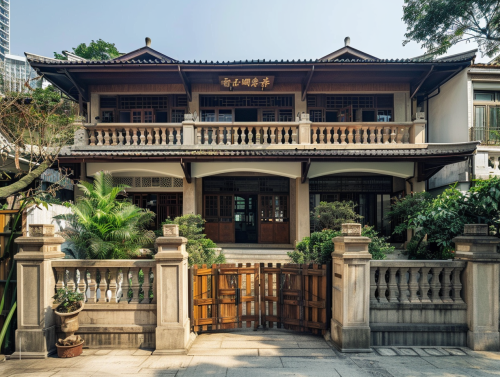 a house in Central, Hong Kong, combining both eastern asian and western european aesthetic elements, colonial style architecture with asian wood structures such as japanese, details like bamboo plants and concrete decorations, lots of details, --ar 4:3 --v 6.0