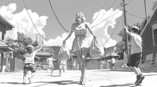 a canadian rockabilly woman with brown hair and a mullet, holding a small black dog in her arms, character design, mystery, serious, drawing style film noir