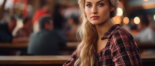 beautiful blond woman wearing plaid dirndl, photo, Canadian, at Octoberfest --ar 21:9 --s 250 --upbeta