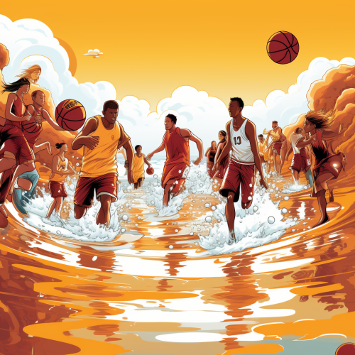 basketball tournament layot in the style of comic book dynamism, editorial illustrations, water around ball, satirical illustrations, maroon and amber, comic art, people on the right, free space on the left, happy, bright,125:41