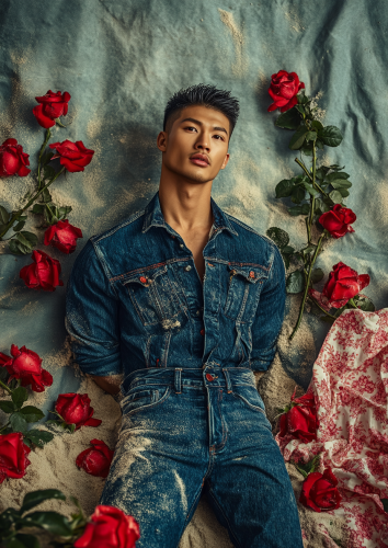 a handsome tall young asian filipino-chinese man in denim outfit, concrete abstract studio background with a retro high school yearbook lighting feel standing on sand, abstract surreal photography . vogue editorial layout pose with david lachapelle influence. red roses around him, christmas filipino items around him, coconut oil nearby, cement background, a few patterns of old floral bed sheets. --ar 5:7