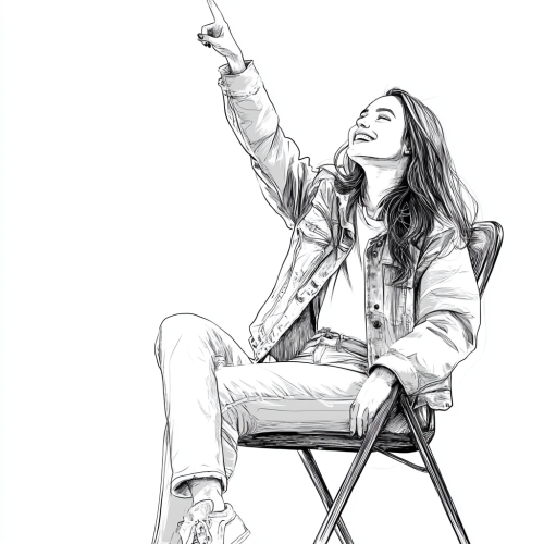 very light black-and white illustration sketch with a vector clear background of beautiful female wearing early 2000s clothing sitting on a chair smiling pointing into the air, minimalist, full length