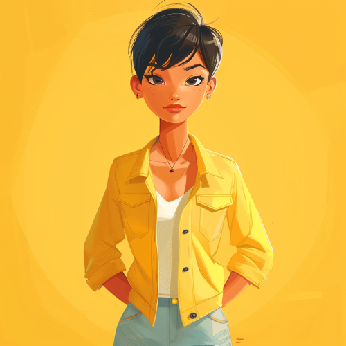 An eye-catching illustration of a vibrant young girl, depicted in a modern and stylish outfit. She has short, sleek hair and a bright, genuine smile. Her posture is confident as she stands at full height, exuding a positive and energetic vibe. The image showcases intricate details in her clothing, featuring contemporary fashion elements, with a clean and polished illustration style. The colors are lively and harmonious, creating a visually appealing and modern aesthetic. --v 6.0 --s 250