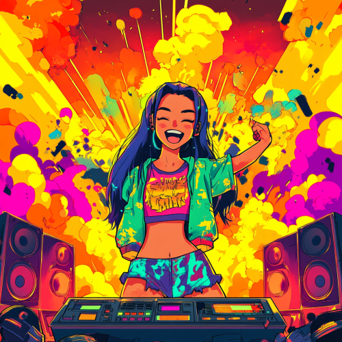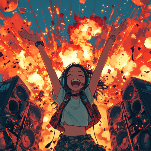 Please generate a cover album for me, for the edm song. Make it Asian cartoon style and reminiscent of the future. Let's have a girl who's happy in the middle and there's loudspeakers and explosions behind her. It needs to be very detailed. The girl should be older, 4k